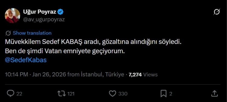 Avukat Uğur Poyraz, X hesabından yaptığı paylaşımda, “Müvekkilem Sedef Kabaş aradı, gözaltına alındığını söyledi. Ben de şimdi Vatan Emniyet’e geçiyorum” ifadelerini kullandı.