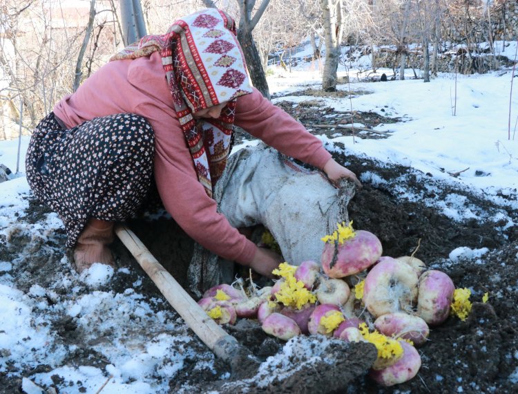 “Eylülde pancar, şalgam, turp ve patatesi toprağa gömeriz. Toprak soğuk olduğu için ürünler hiç bozulmaz, ilk günkü gibi durur. Kendimiz tüketiyoruz, hayvanlarımıza yediriyoruz, fazlasını da satıyoruz. Bu yöntemi anamızdan, atamızdan öğrendik.” dedi.