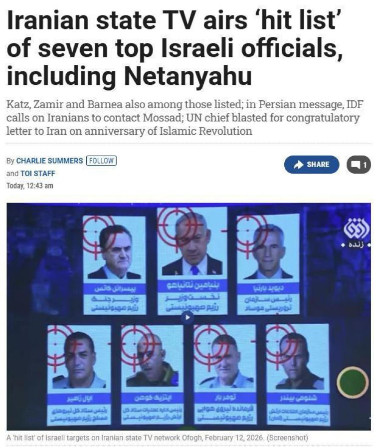 İran’da Devrim Muhafızları’na bağlı Ofogh TV’de yayımlanan programda, İsrail Başbakanı Netanyahu ve altı üst düzey İsrailli yetkilinin hedef alındığı tehdit içerikli bir görsel paylaşıldı. Yayın, ABD-İran nükleer müzakerelerinin sürdüğü kritik bir dönemde gerçekleşti.