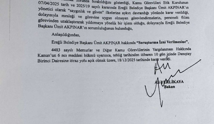 İçişleri Bakanlığı, Konya’nın Ereğli ilçesinde Belediye Başkanı Ümit Akpınar hakkında soruşturma izni verdi. Karar, İçişleri Bakanı Ali Yerlikaya’nın imzasıyla alınırken, kamuoyuna yansıyan etik ihlal ve mobbing iddiaları sonrası gündeme geldi.