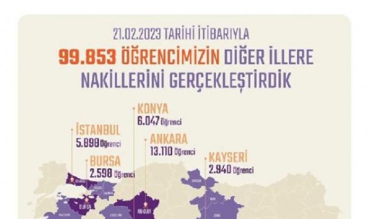 Paylaşımda, öğrencilerin nakillerinin yapıldığı bazı illere ilişkin bilgilere de yer verildi. Buna göre, Ankara'ya 13 bin 110, Mersin'e 10 bin 272, Antalya'ya 9 bin 380, Konya'ya 6 bin 47, İstanbul'a 5 bin 898, İzmir'e 3 bin 831, Muğla'ya 3 bin 629, Aydın'a 3 bin 66, Kayseri'ye 2 bin 940, Bursa'ya 2 bin 598 öğrenci nakledildi. HABER MERKEZİ
