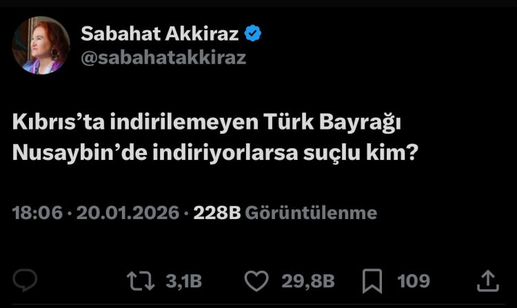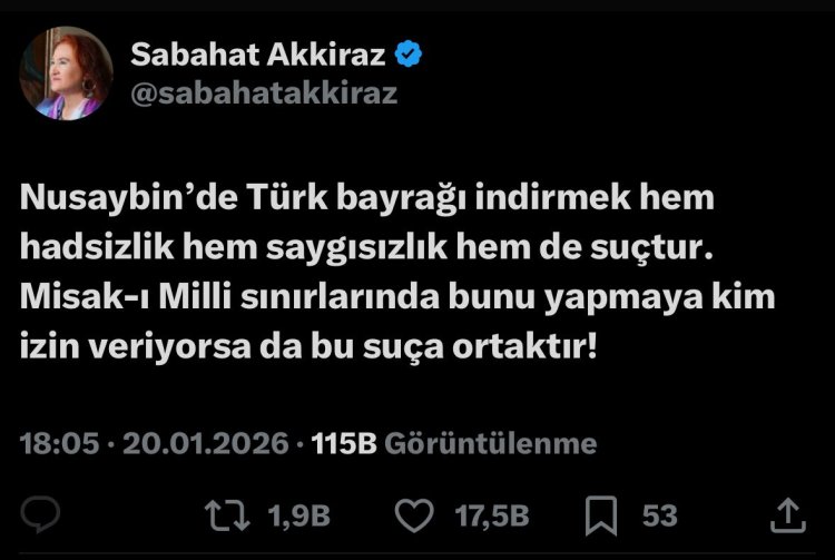 Sanatçı ve eski milletvekili Sabahat Akkiraz, Nusaybin’de yaşanan bayrak olayıyla ilgili X (eski adıyla Twitter) hesabından yaptığı paylaşımlarla kamuoyunun dikkatini çekti. Akkiraz’ın açıklamaları kısa sürede binlerce etkileşim alırken, sosyal medyada geniş bir tartışma başladı.