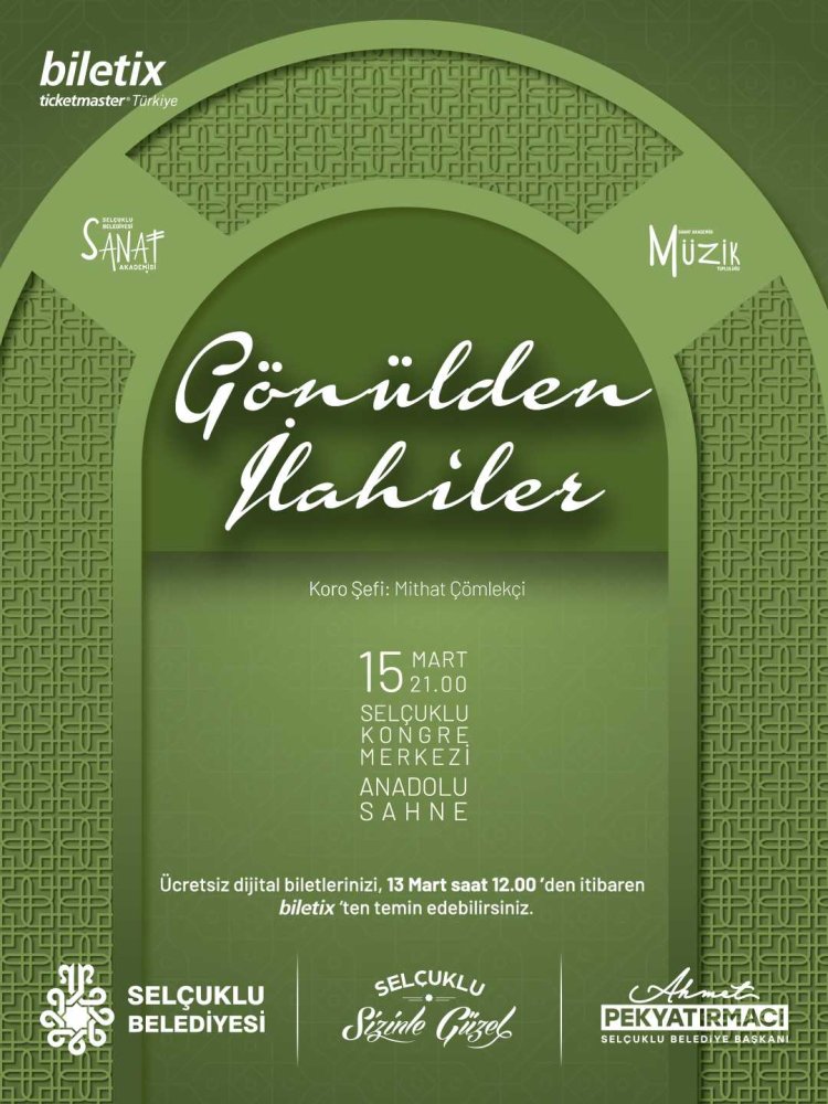 Konser, 15 Mart Pazar günü saat 21.00’de Selçuklu Kongre Merkezi Anadolu Sahne’de gerçekleştirilecek. Programa katılmak isteyen vatandaşlar, ücretsiz biletlerini 13 Mart Cuma günü saat 12.00’den itibaren Biletix’in resmi internet sitesi üzerinden temin edebilecek.